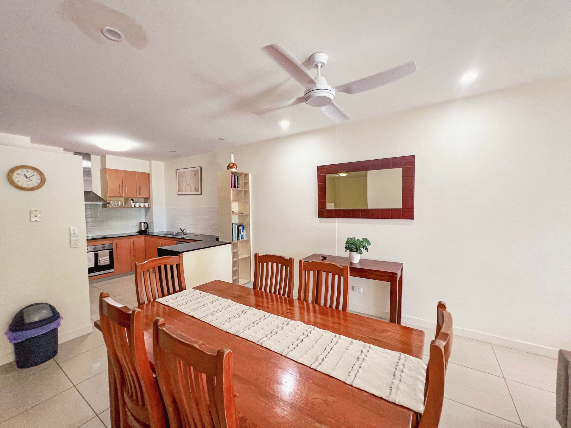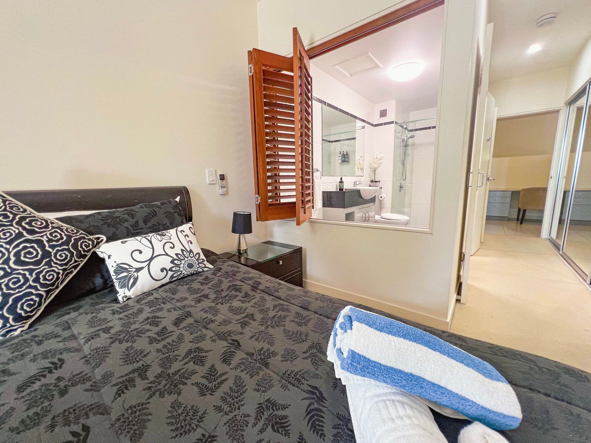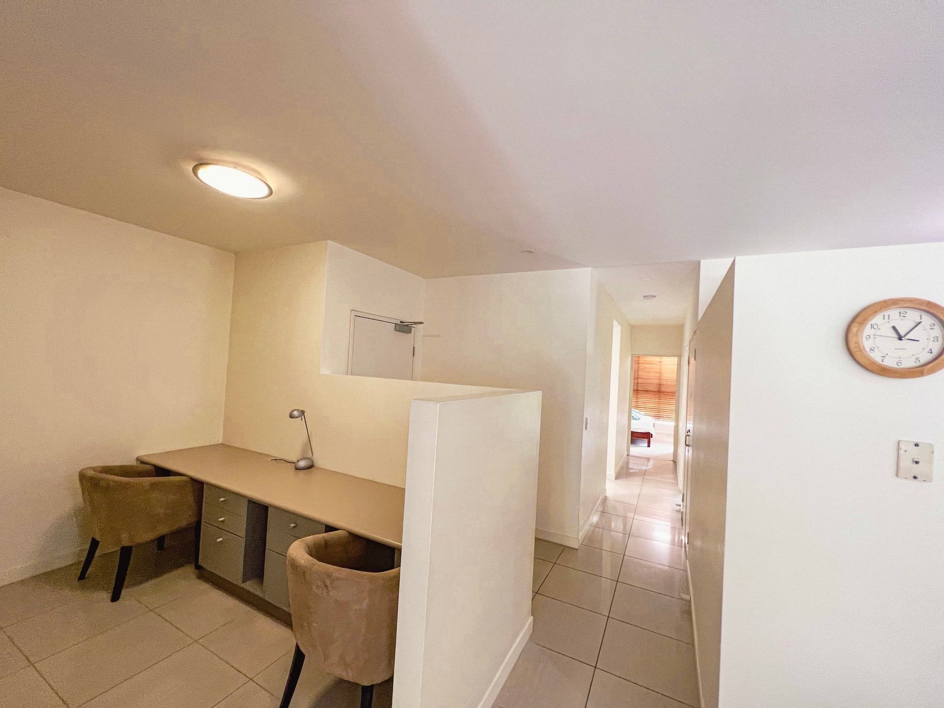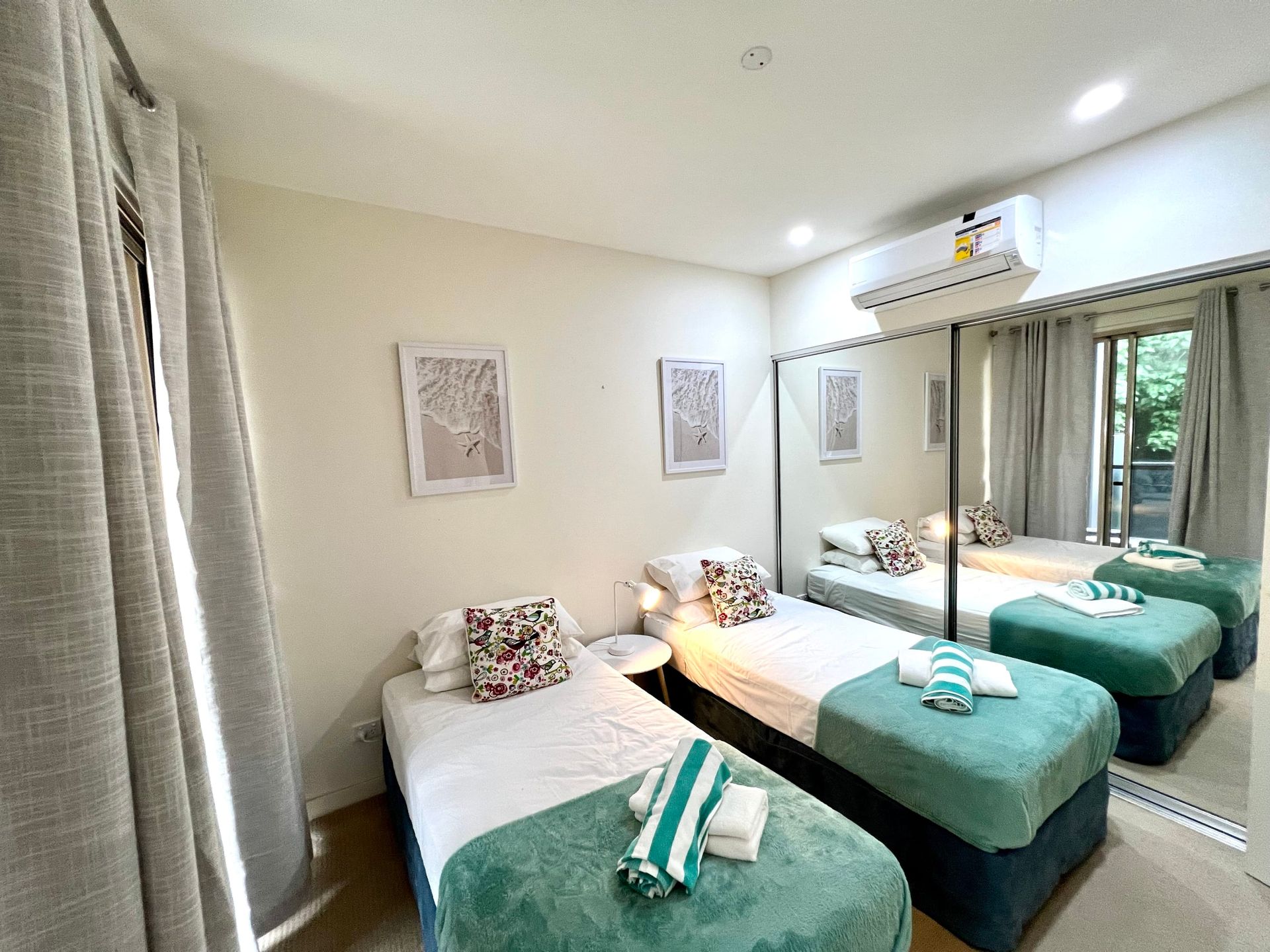 The apartment is tastefully furnished with the main bedroom and lounge room, air-conditioned with a spacious kitchen, 3 bedrooms all with built-in cupboards and a clever office nook with cupboards. The main bedroom has ocean views and an en-suite with bathtub. The other two bedrooms have pool views and share the main bathroom. And, there's a separate laundry.