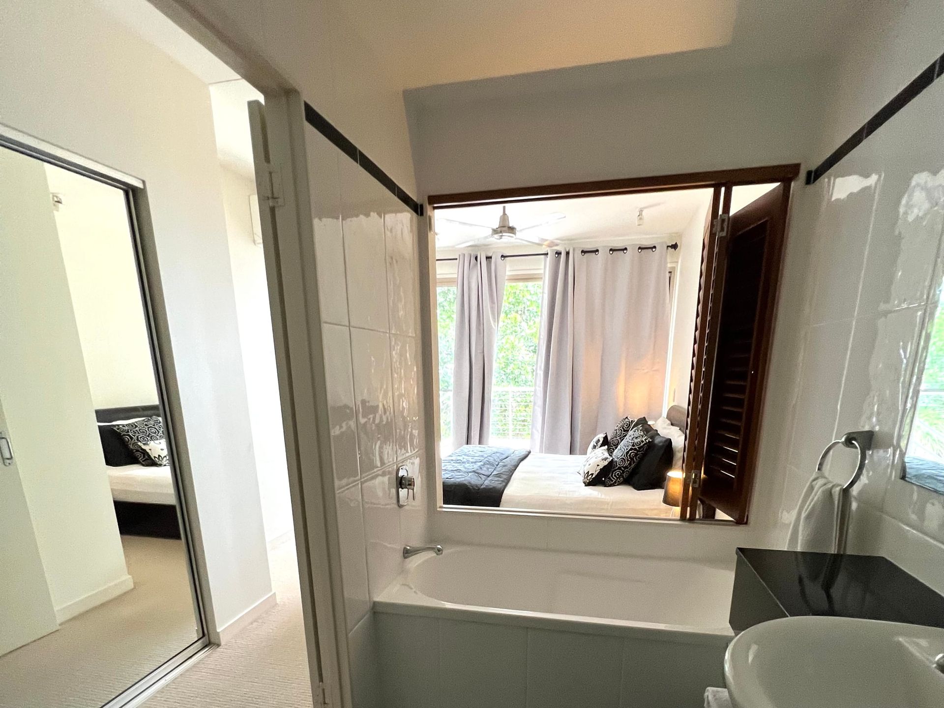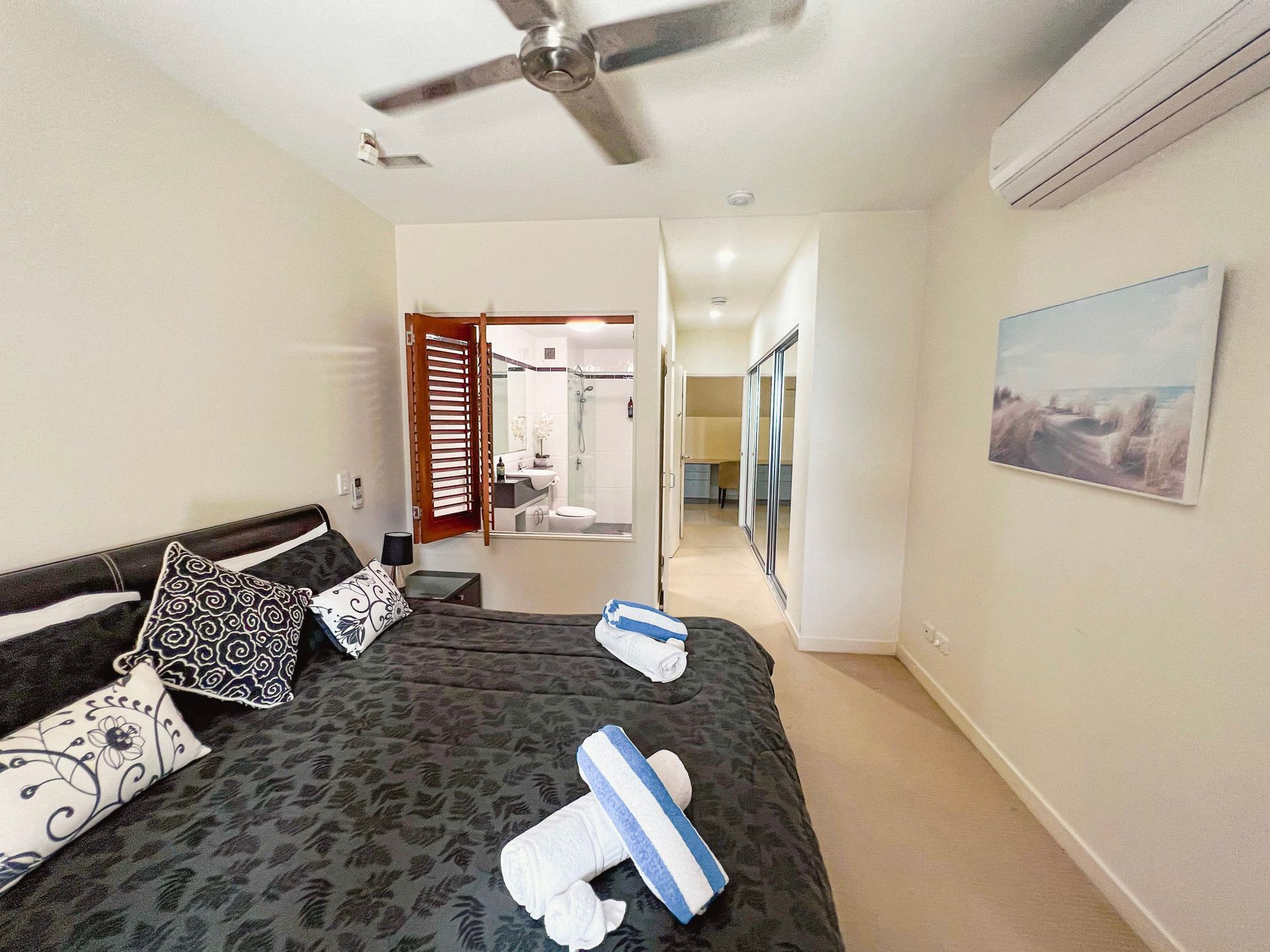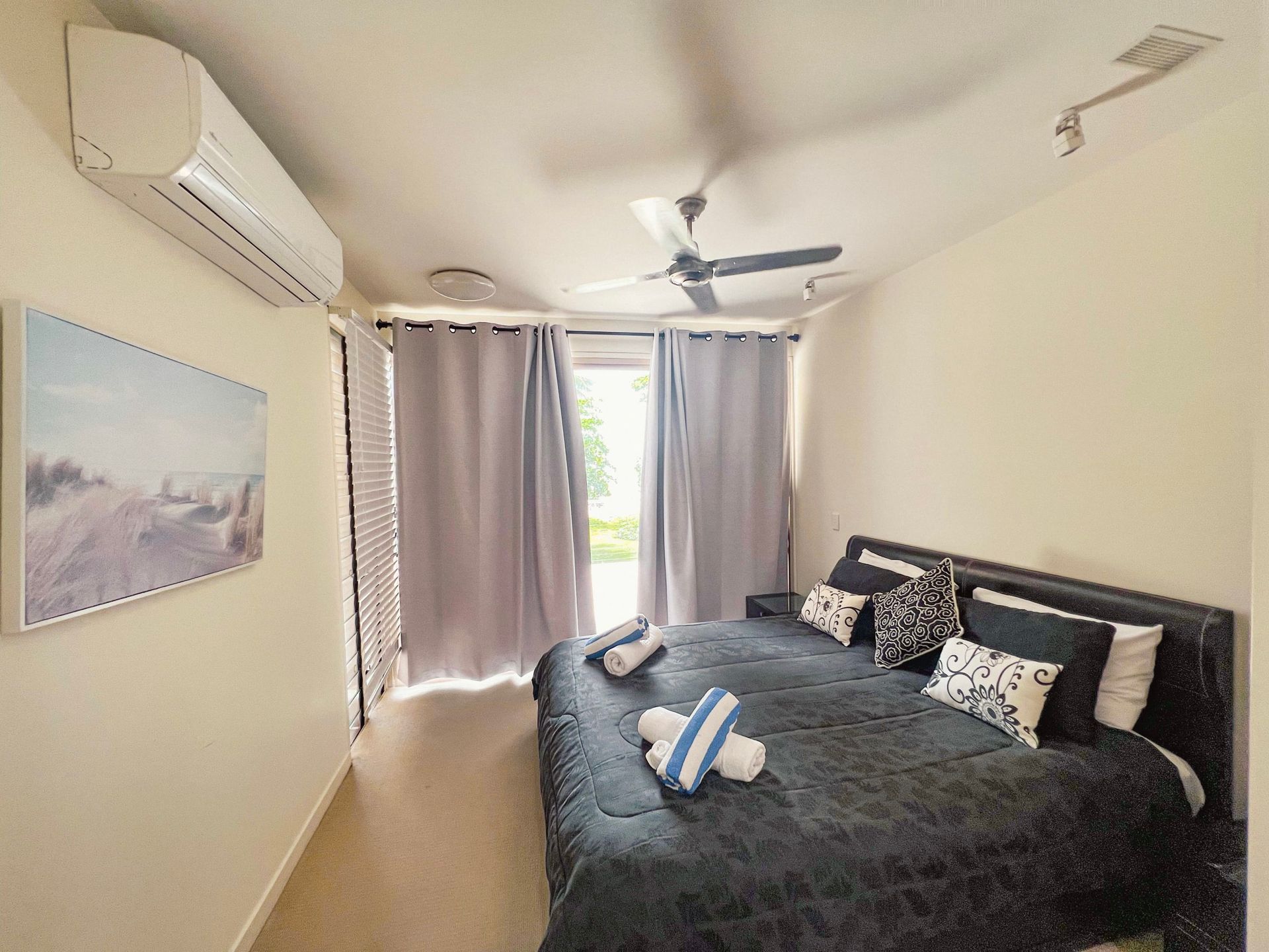 The apartment is tastefully furnished with the main bedroom and lounge room, air-conditioned with a spacious kitchen, 3 bedrooms all with built-in cupboards and a clever office nook with cupboards. The main bedroom has ocean views and an en-suite with bathtub. The other two bedrooms have pool views and share the main bathroom. And, there's a separate laundry.