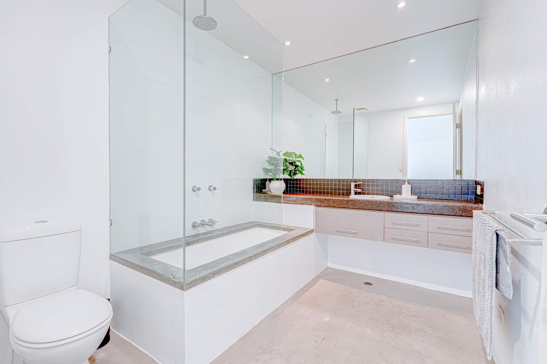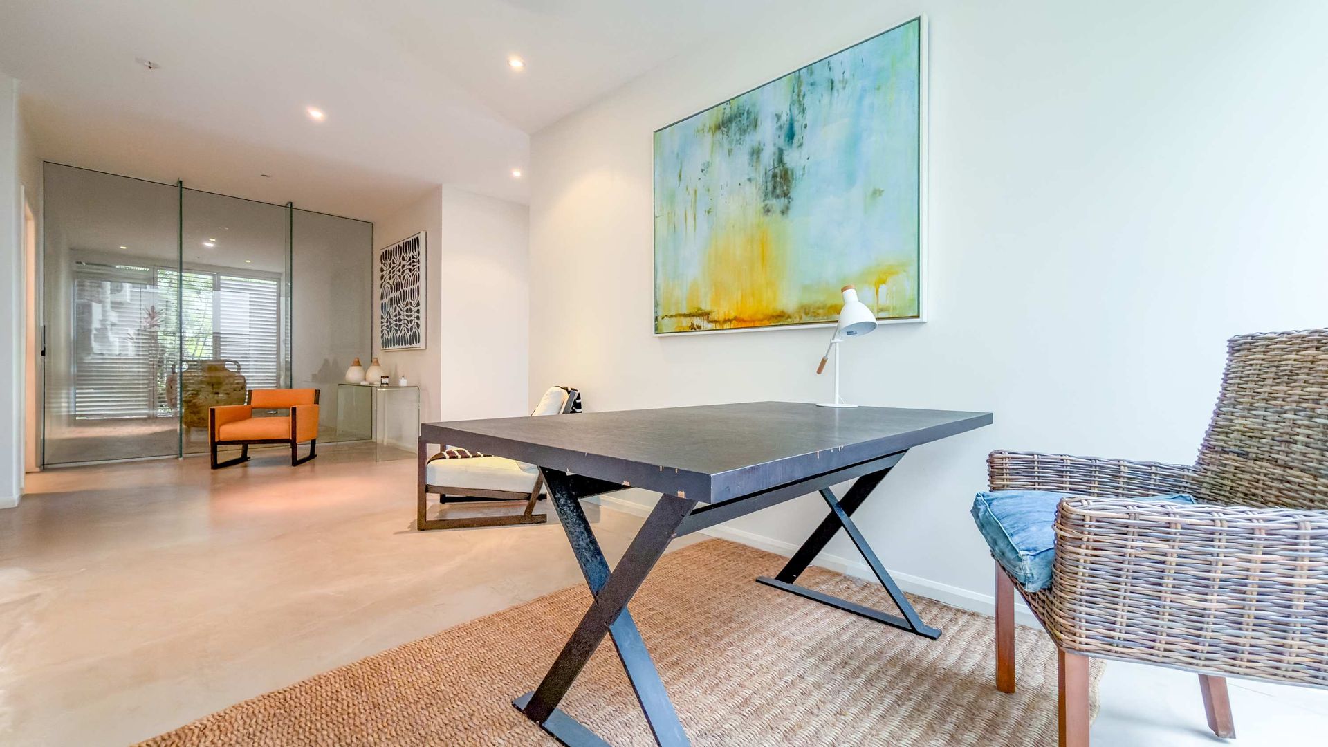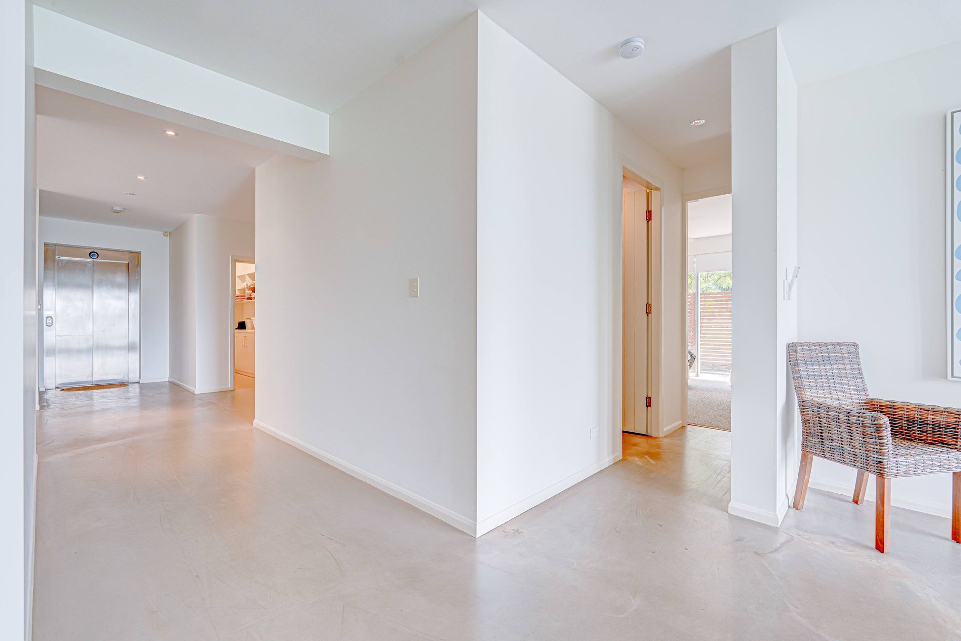 Polished concrete flooring in living zones, plush carpet in bedrooms