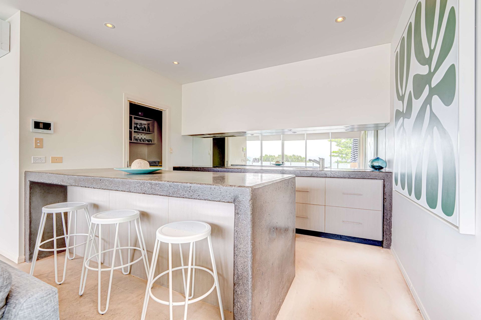 Designer gourmet kitchen with polished concrete benchtops, butler’s pantry (with sink, fridge, dishwasher), and abundant storage