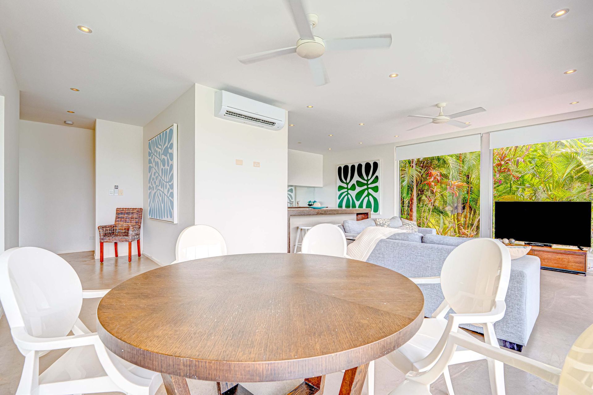 Open-plan living, dining, and kitchen framed by floor-to-ceiling glass for seamless indoor-outdoor living